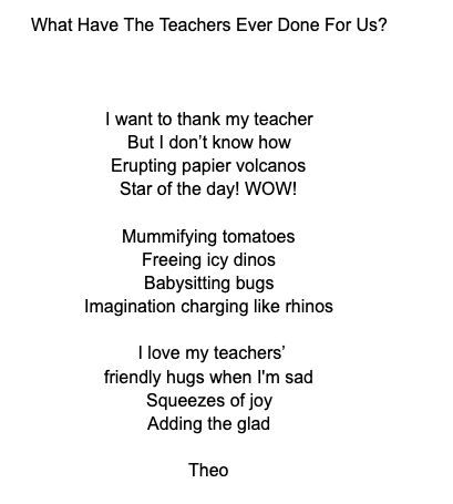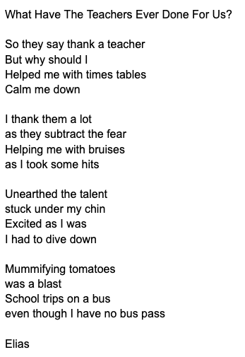 After writing, "What Have the Teachers Ever Done for Us?" I thought I could use it as a model to inspire my Year 6 class to write their own Thank a Teacher poem for kids to celebrate National Thank A Teacher day, UK, on June 23rd.